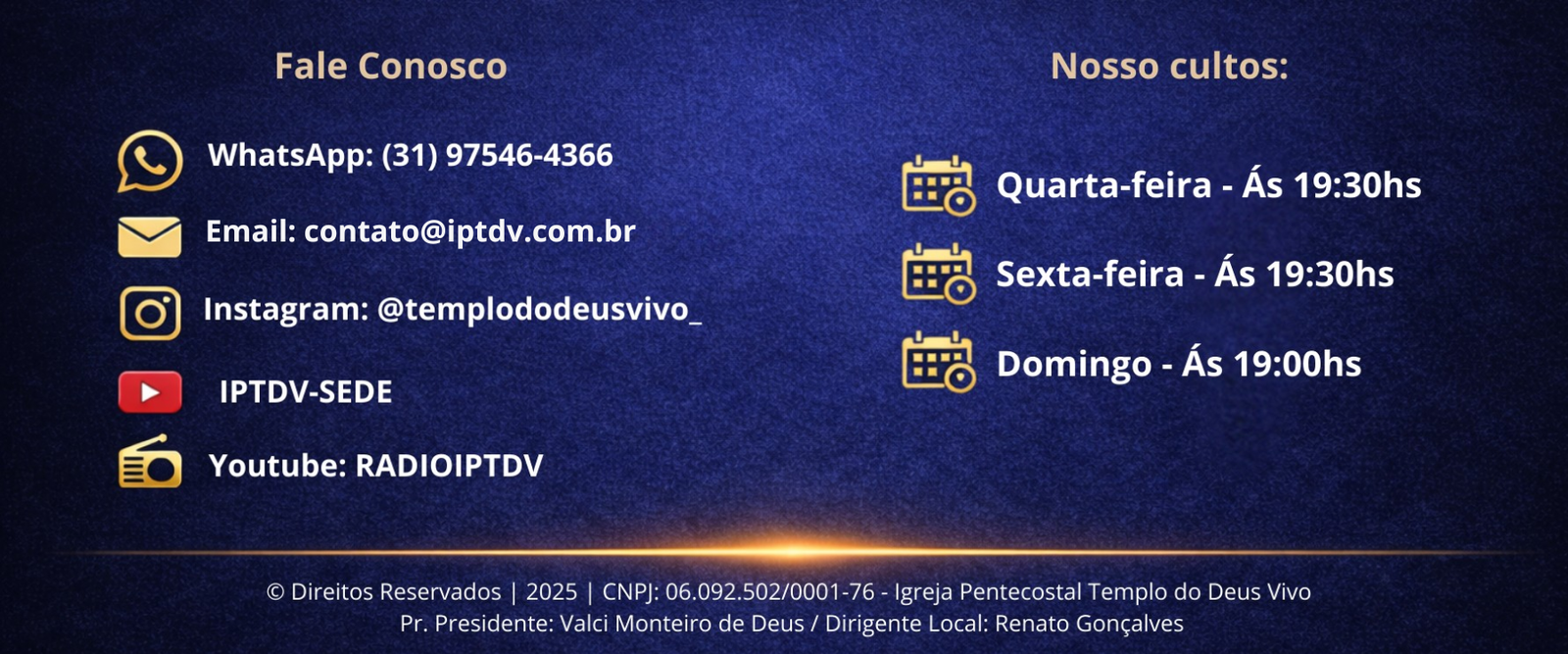A Igreja Pentecostal Templo do Deus Vivo é uma igreja evangélica localizada em Betim/MG, que nasceu com o propósito de anunciar o Evangelho de Jesus Cristo e transformar vidas por meio da Palavra de Deus. Desde 2001, tem sido um lugar de fé, acolhimento e crescimento espiritual, alcançando famílias e levando a presença. Atualmente, contamos com uma filial no bairro Vila Cristina – Betim, expandindo sua missão.